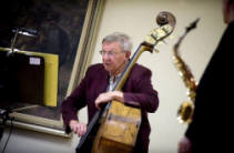 -Nu är det i gång, konstaterade en glad festivalproducent, Bronson B. Månsson, som också konstaterade att festivalen redan hade tjuvstartat med jazzbrunch i både Degeberga och Åhus. -Vi har runt 60 personer här. Det känns bra. Det är första gången vi är i Arkelstorp, men inte sista, sa han medan Ingemar Torstensson, Berndt Sjögren, Kjell-Åke Persson, Lasse Lindqvist och Ingvar Callmer fortsatte med sin bebop från scenen. En bit in i spelningen steg den arton personer stora Maglemerkören in framför scenen och saxofonisten Berndt Sjögren tog med sig sin minsta saxofon och dirigentpinnen ned från scenen och ställde sig framför kören.